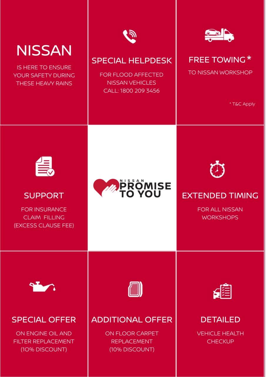 **· निसान ने बाढ़ से प्रभावित ग्राहकों के लिए एक विशेष हेल्पडेस्क स्थापित की, जिसमें निशुल्क रोडसाइड असिस्टेंस (आरएसए) सेवाएं उपलब्ध कराई जाएंगी।**