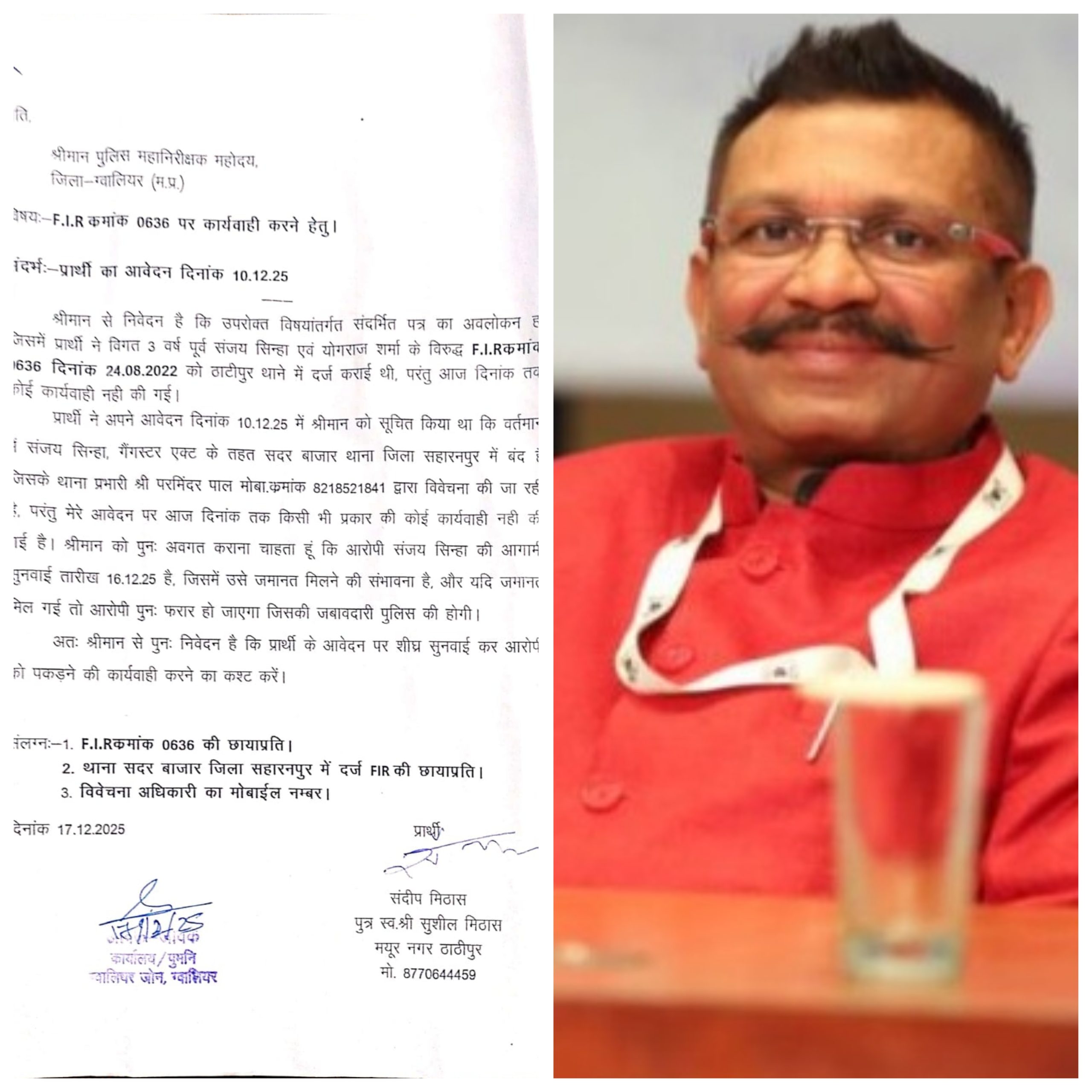 आवेदन में यह भी बताया गया है कि वर्तमान में आरोपी संजय सिन्हा गैंगस्टर एक्ट के तहत थाना सदर बाजार, जिला सहारनपुर (उत्तर प्रदेश) में जेल में बंद है, जहां उसकी विवेचना थाना प्रभारी परमिंदर पाल (मोबाइल: 8218521841) द्वारा की जा रही है। इसके बावजूद ग्वालियर पुलिस द्वारा संबंधित FIR में कोई समन्वयात्मक कार्रवाई नहीं की गई। संदीप मिठास ने आशंका जताई है कि 16.12.2025 को होने वाली सुनवाई में यदि आरोपी को जमानत मिल जाती है, तो वह फिर से फरार हो सकता है, जिसकी जिम्मेदारी पुलिस प्रशासन की होगी।