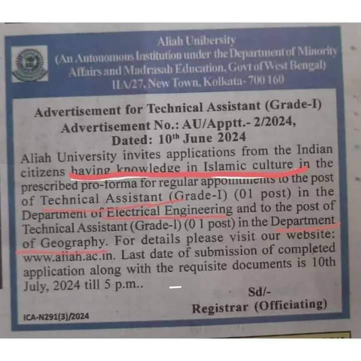 1. **विज्ञापन में इस्लाम की जानकारी आवश्यक**: बंगाल की आलिया यूनिवर्सिटी ने इलेक्ट्रिकल इंजीनियर की नौकरी के लिए जारी विज्ञापन में इस्लाम की जानकारी को अनिवार्य शर्त बताया है।