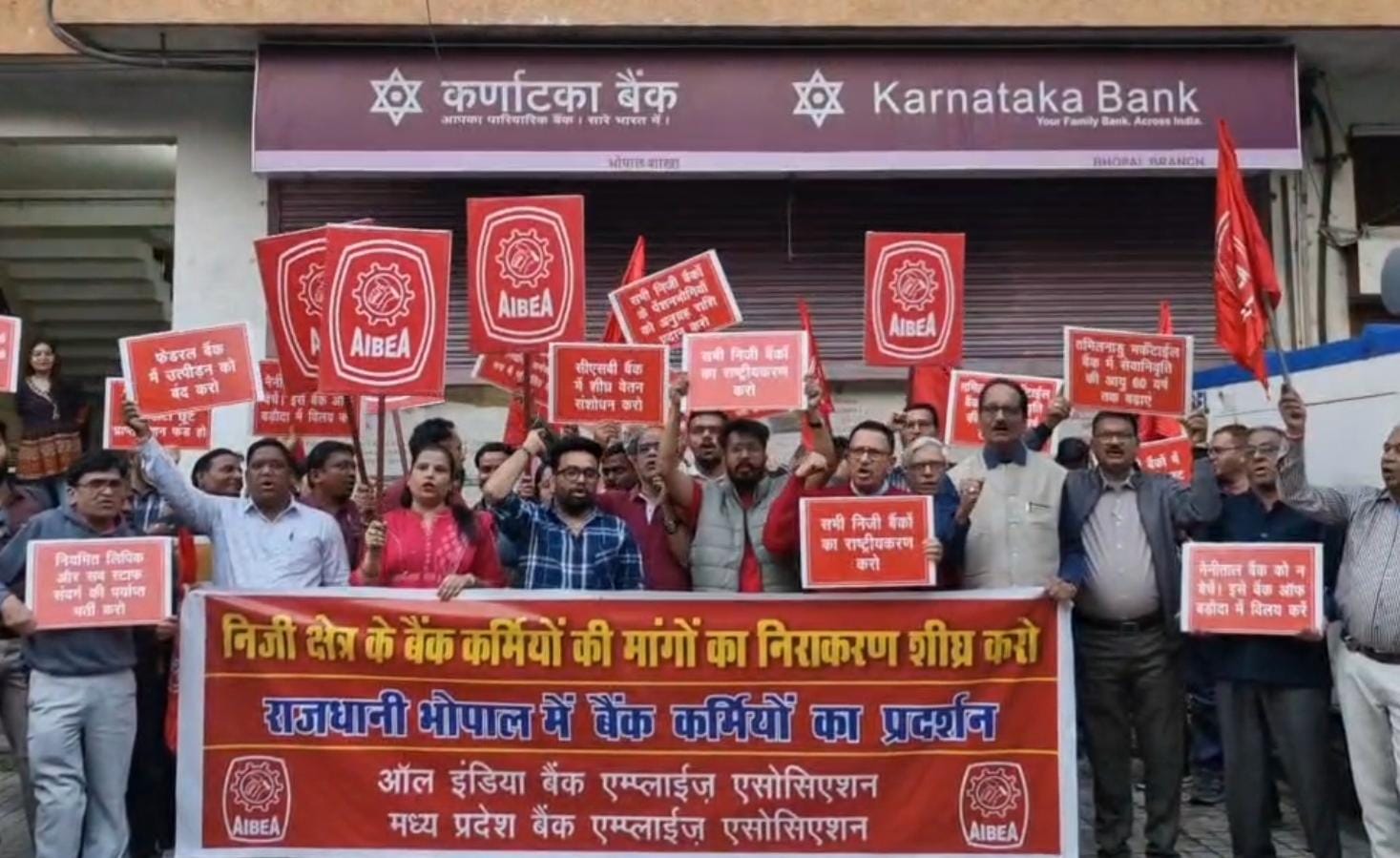 भोपाल, । ऑल इंडिया बैंक एम्प्लाईज एसोसिएशन (AIBEA) के आह्वान पर सोमवार को देशभर में निजी क्षेत्र के बैंक कर्मियों ने अपनी मांगों को लेकर जोरदार प्रदर्शन किया। इसी क्रम में राजधानी भोपाल में मध्यप्रदेश बैंक एम्प्लाईज एसोसिएशन की स्थानीय इकाई द्वारा शिवाजी नगर स्थित कर्नाटका बैंक शाखा के सामने सैकड़ों बैंक कर्मचारियों ने रैली और सभा का आयोजन किया।