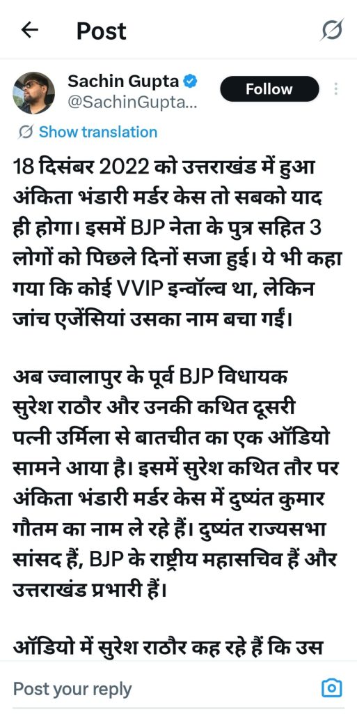 ऑडियो में सुरेश राठौर यह दावा करते हुए सुनाई देते हैं कि हत्या वाली रात दुष्यंत गौतम उसी रिजॉर्ट में मौजूद थे, जहां अंकिता की मौत हुई। बातचीत में यह भी कहा गया है कि अनैतिक संबंधों को लेकर विवाद हुआ था। इतना ही नहीं, सुरेश राठौर यह भी दावा करते हैं कि एक BJP नेत्री के पास पार्टी के एक वरिष्ठ नेता से जुड़े कई ऑडियो-वीडियो मौजूद हैं।