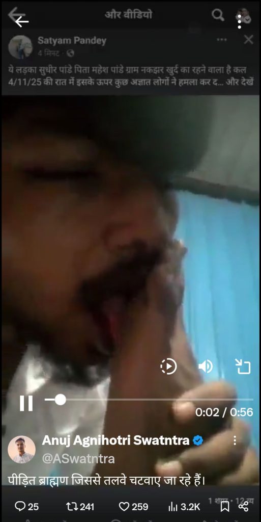 यह दृश्य इतना अमानवीय और वीभत्स है कि देखने वालों का मन द्रवित हो उठता है। सोशल मीडिया प्लेटफॉर्म ‘X’ (पूर्व में ट्विटर) पर यह वीडियो तेजी से वायरल हो रहा है और लोग गुस्से के साथ न्याय की मांग कर रहे हैं। कई यूज़र्स ने लिखा कि “यदि पीड़ित किसी अन्य समुदाय से होता, तो अब तक देशभर में प्रदर्शन हो चुके होते, लेकिन चूंकि वह ब्राह्मण है, इसलिए समाज चुप है।”