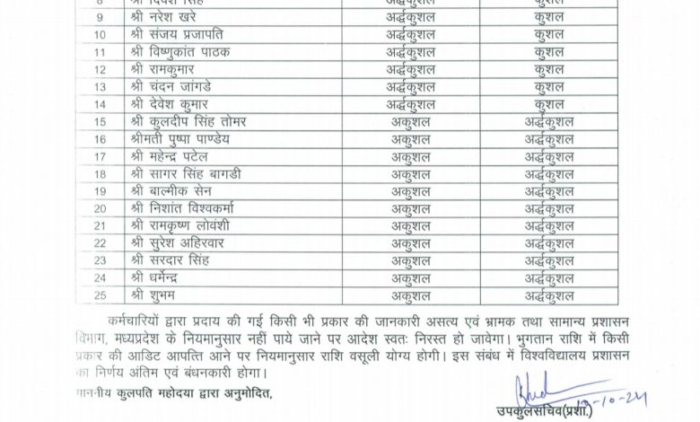 भोपाल। मध्य प्रदेश कर्मचारी मंच के नेतृत्व में आरजीपीवी (राजीव गांधी प्रौद्योगिकी विश्वविद्यालय) के दैनिक वेतन भोगी कर्मचारियों द्वारा किए गए आंदोलन के बाद प्रशासन ने कर्मचारियों की मांगें स्वीकार कर ली हैं। इसके तहत प्रशासन ने दैनिक वेतन भोगियों का श्रेणी परिवर्तन करते हुए अकुशल कर्मचारियों को अर्द्ध कुशल और अर्द्ध कुशल कर्मचारियों को कुशल श्रमिक बनाने के आदेश जारी किए हैं।