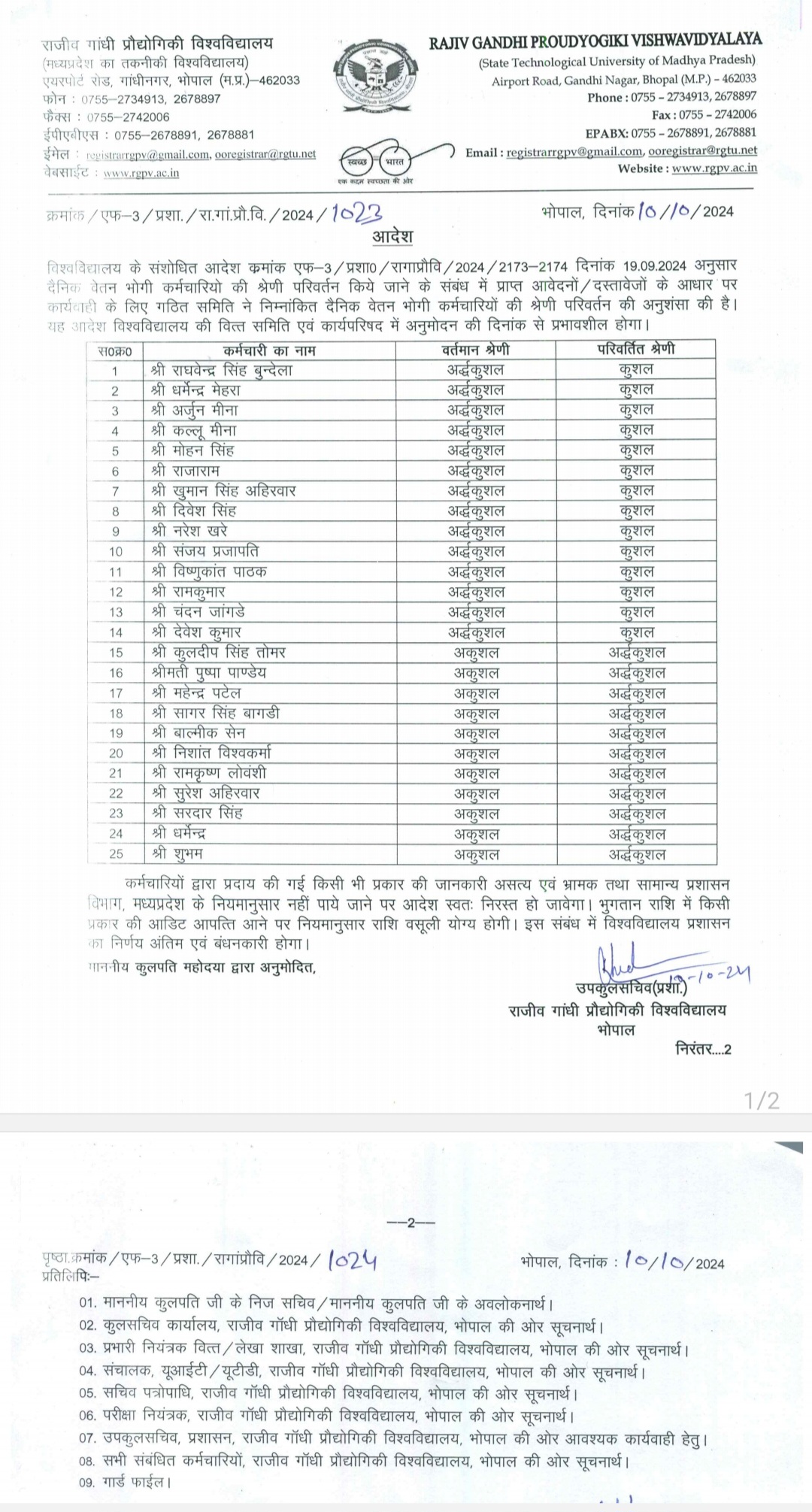 आरजीपीवी के दैनिक वेतन भोगियों का श्रेणी परिवर्तन: प्रशासन ने जारी किए आदेश