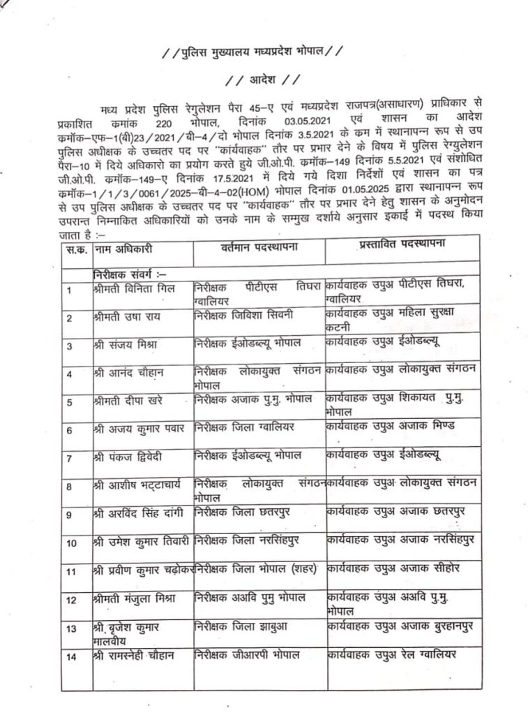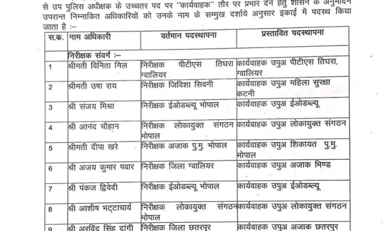 भोपाल में उप पुलिस अधीक्षक स्तर पर प्रशासनिक फेरबदल, शासन ने कार्यवाहक प्रभार देने के आदेश किए जारी
