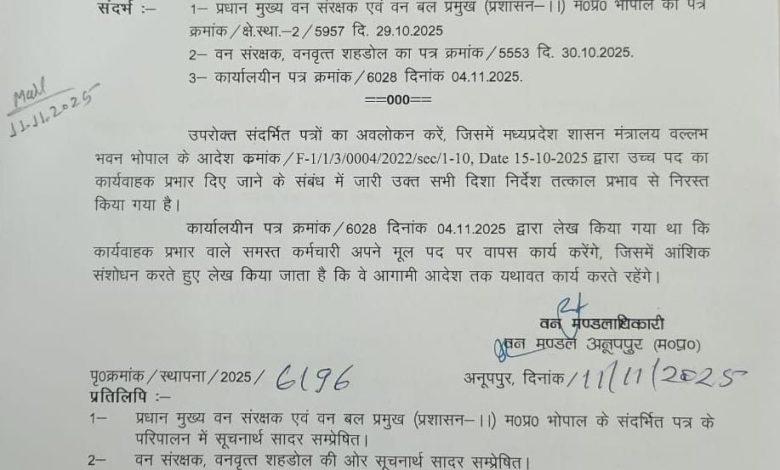 भोपाल। मध्यप्रदेश के अनूपपुर जिले में डीएफओ (वन मंडल अधिकारी) द्वारा जारी किया गया कर्मचारी विरोधी आदेश आखिरकार रद्द कर दिया गया है। यह कदम तब उठाया गया जब मध्यप्रदेश कर्मचारी मंच ने मुख्यमंत्री को पत्र लिखकर आदेश को नियमविरुद्ध बताया और इसे तत्काल निरस्त करने की मांग की। जानकारी के अनुसार डीएफओ अनूपपुर विपिन पटेल ने 4 नवंबर 2025 को एक आदेश जारी किया था, जिसमें उच्चतर पद के प्रभार पर पदस्थ वन कर्मचारियों को बिना शासनादेश के पदावनत करने का निर्देश दिया गया था। यह आदेश न केवल शासन के निर्धारित नियमों के विपरीत था, बल्कि कर्मचारियों के अधिकारों का भी उल्लंघन कर रहा था।