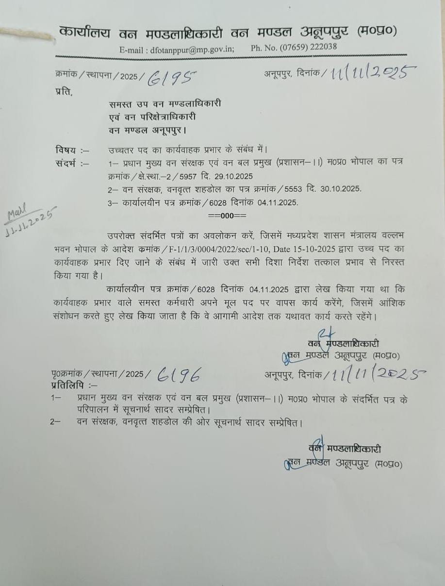 भोपाल। मध्यप्रदेश के अनूपपुर जिले में डीएफओ (वन मंडल अधिकारी) द्वारा जारी किया गया कर्मचारी विरोधी आदेश आखिरकार रद्द कर दिया गया है। यह कदम तब उठाया गया जब मध्यप्रदेश कर्मचारी मंच ने मुख्यमंत्री को पत्र लिखकर आदेश को नियमविरुद्ध बताया और इसे तत्काल निरस्त करने की मांग की। जानकारी के अनुसार डीएफओ अनूपपुर विपिन पटेल ने 4 नवंबर 2025 को एक आदेश जारी किया था, जिसमें उच्चतर पद के प्रभार पर पदस्थ वन कर्मचारियों को बिना शासनादेश के पदावनत करने का निर्देश दिया गया था। यह आदेश न केवल शासन के निर्धारित नियमों के विपरीत था, बल्कि कर्मचारियों के अधिकारों का भी उल्लंघन कर रहा था।