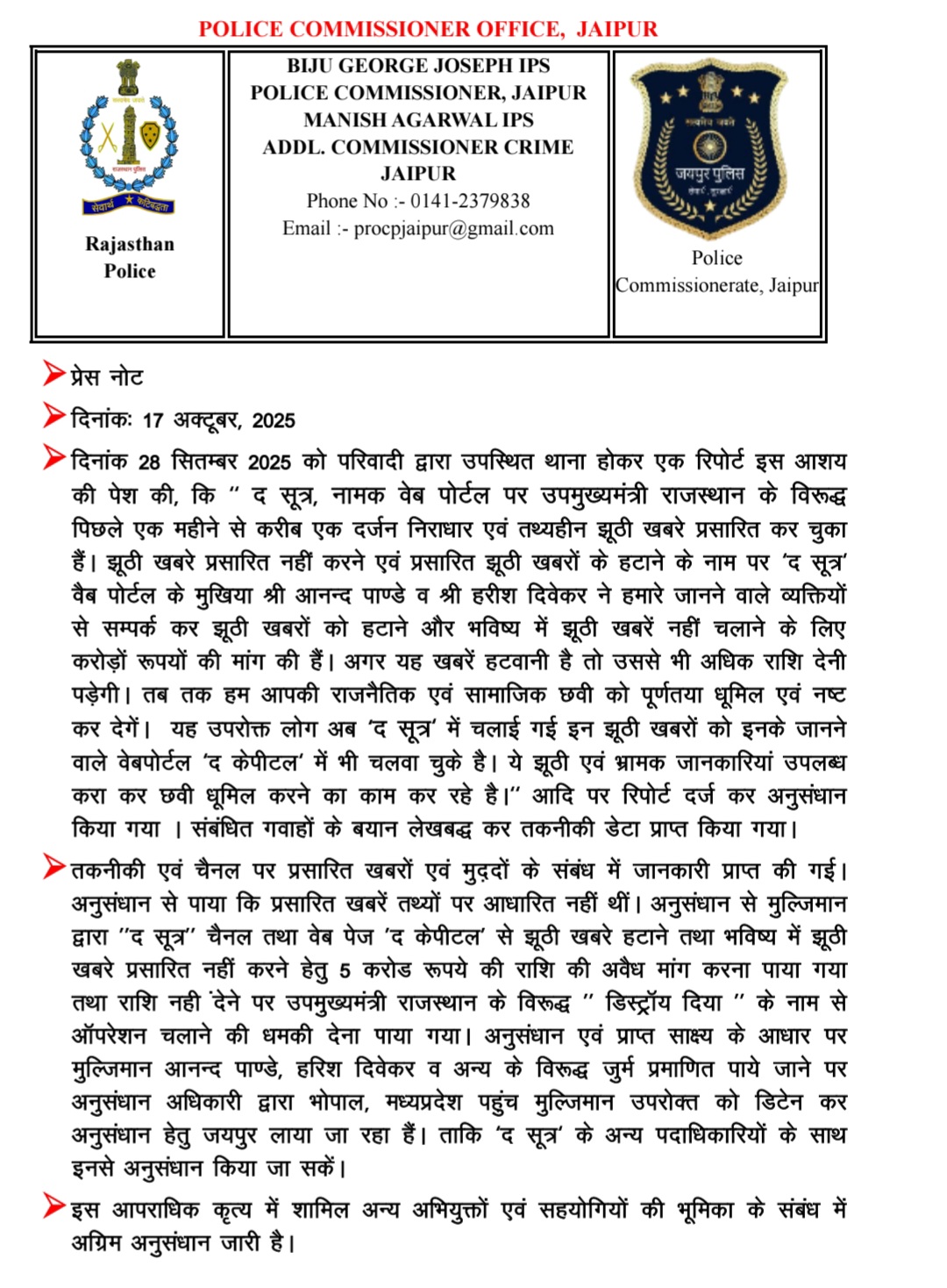पुलिस रिपोर्ट के अनुसार 28 सितम्बर 2025 को एक परिवादी ने जयपुर के संबंधित थाने में रिपोर्ट दर्ज कराई थी कि द सूत्र नामक वेब पोर्टल ने राजस्थान के उपमुख्यमंत्री के खिलाफ एक महीने के भीतर लगभग एक दर्जन तथ्यहीन और निराधार खबरें प्रकाशित कीं। परिवादी ने आरोप लगाया कि इन खबरों को हटाने और आगे झूठी रिपोर्टें प्रकाशित न करने के लिए द सूत्र के प्रमुख आनंद पांडे और हरीश दिवेकर ने उनके परिचितों से संपर्क कर करोड़ों रुपए की मांग की। कथित रूप से उन्होंने धमकी दी कि यदि भुगतान नहीं किया गया, तो हम आपकी राजनीतिक और सामाजिक छवि को पूरी तरह नष्ट कर देंगे। रिपोर्ट में यह भी उल्लेख है कि झूठी खबरें न केवल द सूत्र पर बल्कि उससे जुड़े दूसरे पोर्टल द केपीटल पर भी प्रकाशित की गईं। पुलिस ने तकनीकी साक्ष्य, वीडियो फुटेज और ईमेल रिकॉर्ड के आधार पर यह पाया कि प्रसारित खबरें तथ्यों पर आधारित नहीं थीं और ब्लैकमेलिंग के इरादे से चलाई गईं।