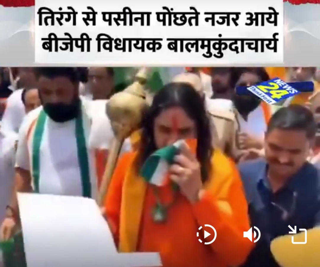 जयपुर। राजस्थान की राजधानी जयपुर से भारतीय जनता पार्टी के विधायक बालमुकुंदाचार्य एक वायरल वीडियो को लेकर विवादों में घिर गए हैं। वीडियो में उन्हें एक सार्वजनिक रैली के दौरान कथित तौर पर राष्ट्रीय ध्वज तिरंगे से पसीना पोंछते हुए देखा गया। यह वीडियो सोशल मीडिया पर तेज़ी से वायरल हो रहा है, और इस पर राजनीतिक प्रतिक्रियाएं भी सामने आने लगी हैं।