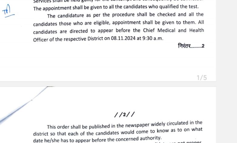 उक्त आदेश के अनुसार, सभी याचिकाकर्ता जिनका नाम परीक्षा में मेरिट सूची में है, उन्हें नियुक्ति संबंधी प्रक्रिया के लिए जरूरी दस्तावेजों का परीक्षण करवाना आवश्यक है। इसके लिए उम्मीदवारों को 08 नवंबर 2024 को सुबह 9:30 बजे अपने संबंधित जिले के मुख्य चिकित्सा एवं स्वास्थ्य अधिकारी के कार्यालय में समस्त दस्तावेजों, जैसे पहचान प्रमाण, शैक्षणिक प्रमाणपत्र, और माननीय न्यायालय के निर्णय की सर्टिफाईड कॉपी के साथ उपस्थित होना सुनिश्चित करना होगा।