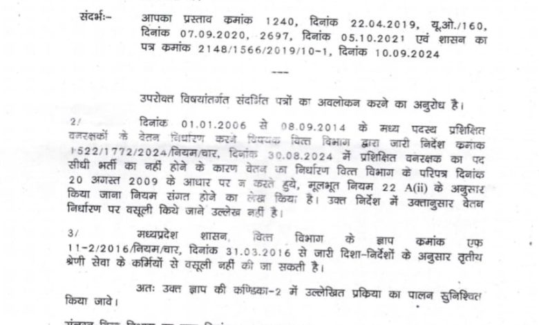 भोपाल। वन विभाग के वन रक्षकों के वेतन से वसूली के मामले में सरकार ने बड़ा फैसला लेते हुए इसे पूरी तरह से निरस्त कर दिया है। अब वन रक्षकों के वेतन से किसी भी प्रकार की वसूली नहीं की जाएगी, भले ही उन्हें वेतन निर्धारण की प्रक्रिया के चलते अधिक वेतन मिला हो। इस आदेश का स्वागत मध्य प्रदेश कर्मचारी मंच, वन विभाग ने किया है।