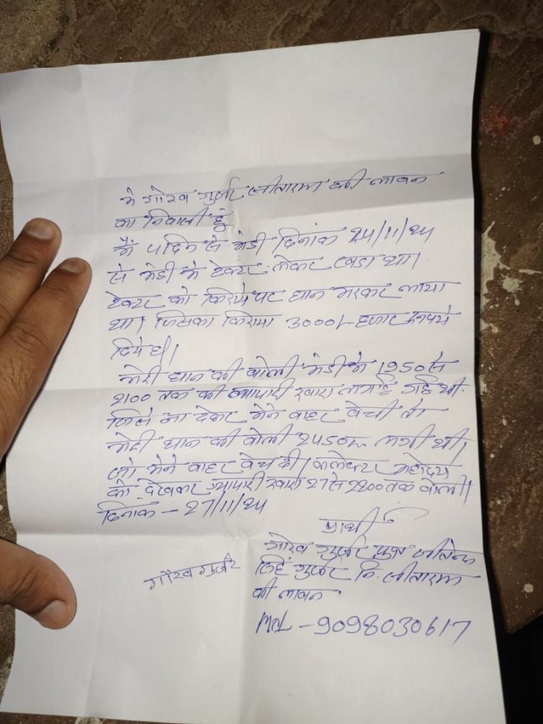 गोरब गुर्जर के अनुसार, मंडी में उनकी धान की बोली 1950-2100 रुपये तक लगाई गई थी, लेकिन उन्होंने यह बोली स्वीकार नहीं की। इसके बजाय, उन्होंने अपने धान को बाहर बेच दिया, जहां उसे 2450 रुपये की कीमत पर बेचा गया। गोरब ने आरोप लगाया कि इसके बाद कलेक्टर के निरीक्षण के बाद 27 नवम्बर से व्यापारी ने धान की बोली 2200 रुपये तक लगाना शुरू कर दी।