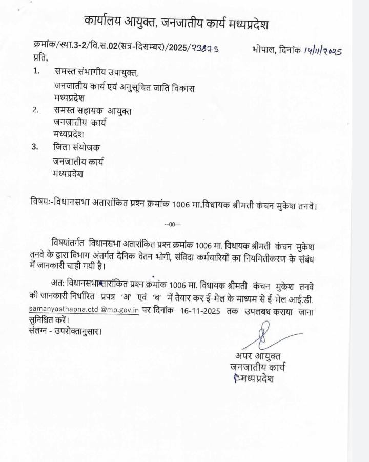 भोपाल। मध्यप्रदेश विधानसभा के आगामी सत्र में जनजाति कार्य विभाग के दैनिक वेतनभोगी और अंशकालीन कर्मचारियों का मुद्दा जोरदार तरीके से उठने वाला है। विधायक श्याम बरड़े और कंचन मुकेश तनवे ने इन कर्मचारियों के नियमितीकरण और सातवें वेतनमान, अनुकंपा नियुक्ति तथा पेंशन लाभ जैसे प्रमुख मुद्दों पर सरकार से जवाब मांगते हुए 4 दिसंबर 2025 को विधानसभा में प्रश्न प्रस्तुत करने की घोषणा की है। मध्यप्रदेश कर्मचारी मंच ने दोनों विधायकों का आभार व्यक्त करते हुए कहा कि पहली बार विधानसभा में इस वर्ग के अधिकारों पर इतने प्रभावी तरीके से प्रश्न उठाए जा रहे हैं। मंच के प्रदेश अध्यक्ष अशोक पांडे ने प्रेस विज्ञप्ति में बताया कि विधायकों ने सरकार से पूछा है कि जनजाति कार्य विभाग में दैनिक वेतनभोगी और अंशकालीन कर्मचारियों के नियमितीकरण की नीति अब तक क्यों नहीं बनी, और यदि बनी है तो उसे सदन में प्रस्तुत किया जाए।