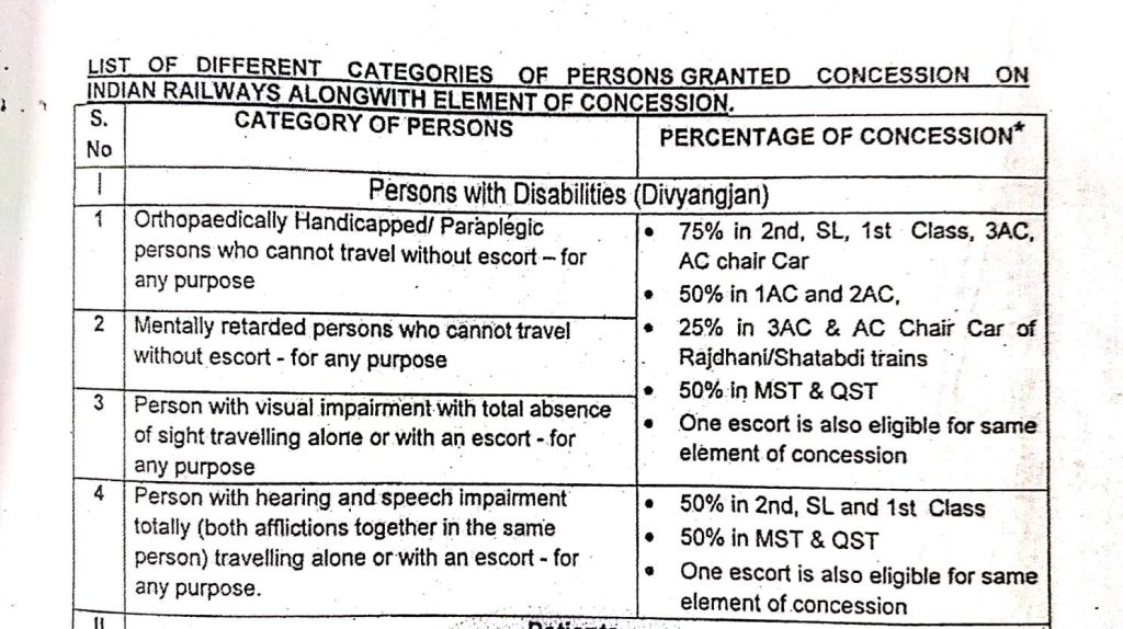 भारतीय रेलवे ऑर्थोपेडिकली हैंडिकैप्ड, दृष्टिहीन, मानसिक रूप से अस्वस्थ, श्रवण और वाणी बाधित यात्रियों को 25% से 75% तक की छूट प्रदान करता है।