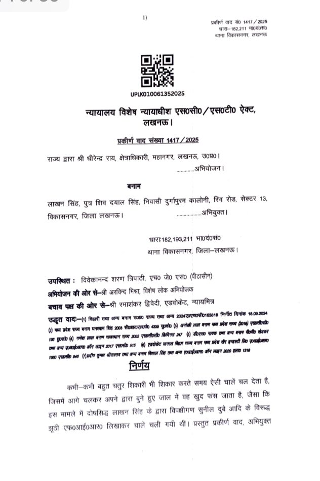 लखनऊ| विशेष न्यायाधीश SC/ST एक्ट विवेकानंदशरण त्रिपाठी की अदालत ने शुक्रवार को एक ऐतिहासिक और नजीर पेश करने वाला फैसला सुनाया। अदालत ने अधिवक्ता लाखन सिंह को झूठी FIR दर्ज कर न्याय व्यवस्था के दुरुपयोग के मामले में 10 साल 6 महीने की कठोर कैद और ₹2.51 लाख के आर्थिक दंड की सजा सुनाई है।