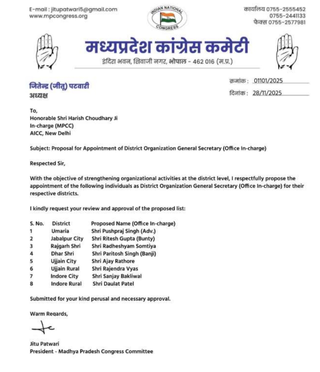 मध्य प्रदेश कांग्रेस ने जिला संगठन महासचिवों की नई नियुक्तियाँ कीं