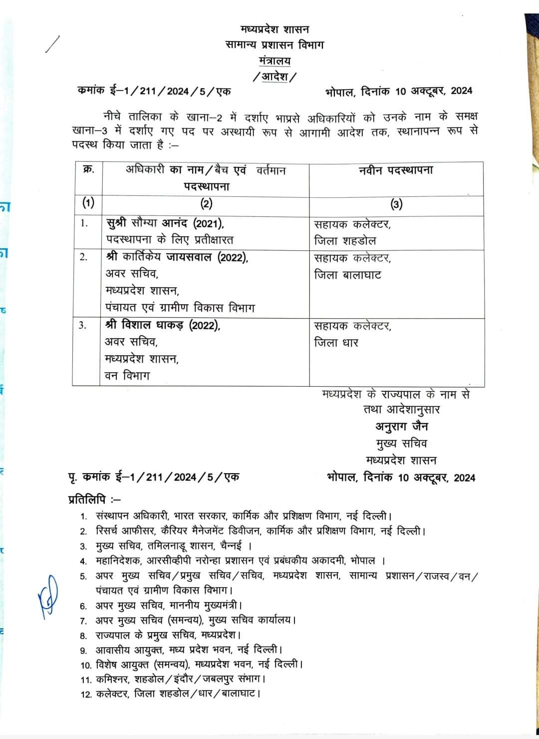 शासन द्वारा जारी इस आदेश का उद्देश्य प्रशासनिक कार्यों में सुधार लाना और विभिन्न जिलों में सुचारु संचालन सुनिश्चित करना है। सभी नए पदस्थ अधिकारी आगामी आदेश तक अस्थायी रूप से अपनी जिम्मेदारी निभाएंगे।