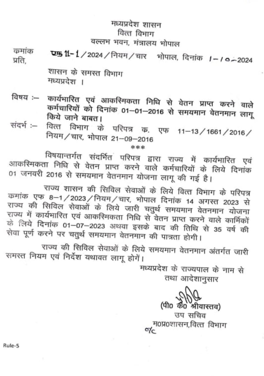 मध्य प्रदेश: कार्यभारित कर्मचारियों को मिलेगा चतुर्थ समयमान वेतनमान का लाभ, 60 हजार कर्मचारी होंगे लाभान्वित
