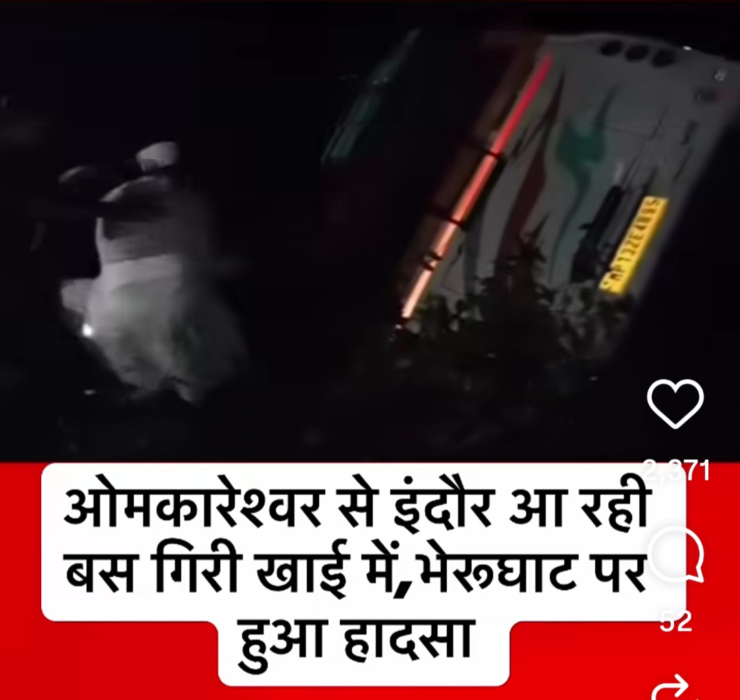 खंडवा (मध्यप्रदेश): ओंकारेश्वर से इंदौर जा रही एक यात्री बस सोमवार सुबह भेरुघाट क्षेत्र में 20 फीट गहरी खाई में गिर गई, जिससे बड़ा हादसा हो गया। बस में सवार लगभग 40 से अधिक यात्री थे। हादसे के बाद मौके पर चीख-पुकार मच गई और स्थानीय लोगों ने तत्काल पुलिस व प्रशासन को सूचना दी।
