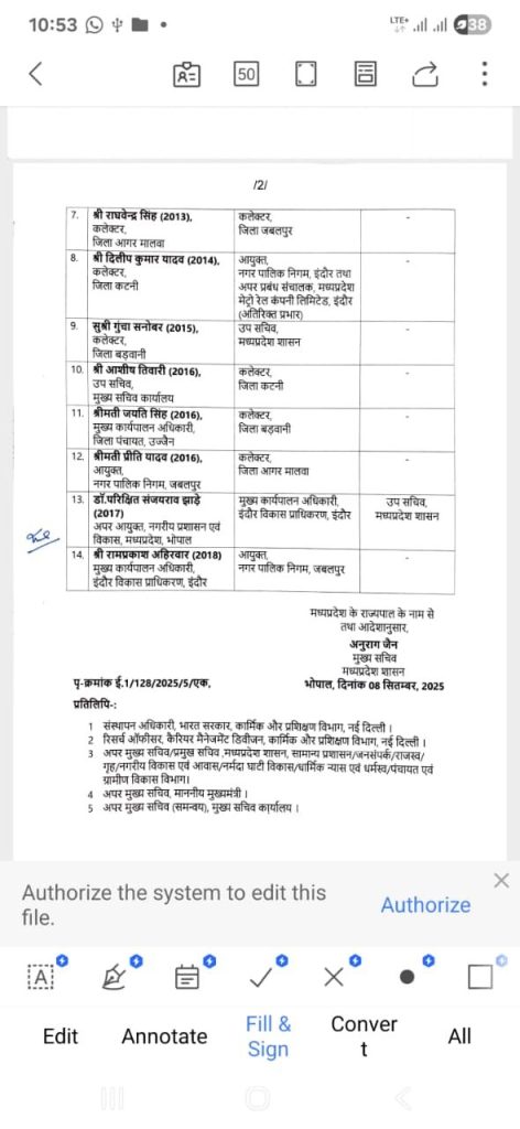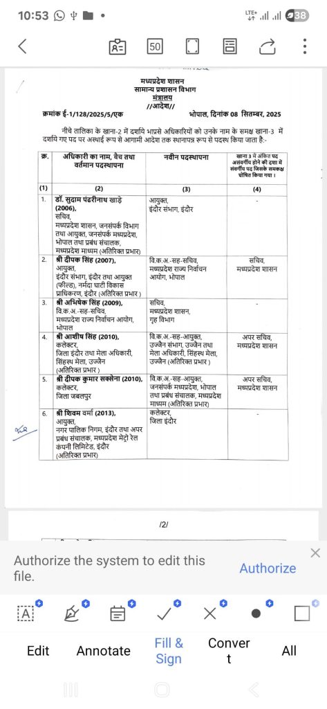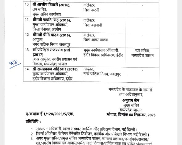 मध्यप्रदेश में IAS अधिकारियों का बड़ा प्रशासनिक फेरबदल: आशीष सिंह उज्जैन संभागायुक्त, इंदौर संभागायुक्त का जिम्मा अब डॉ. सुदाम खाड़े को
