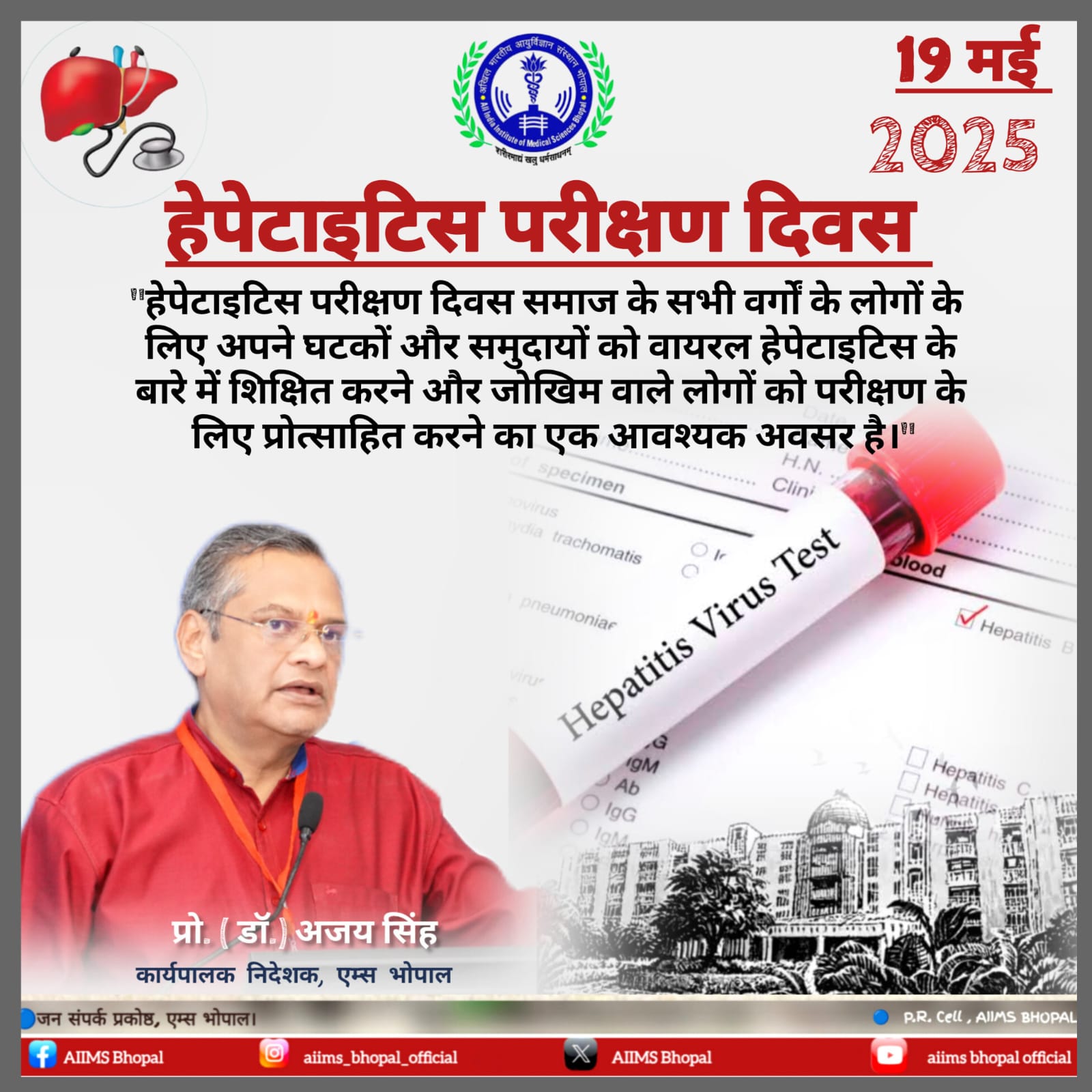 भोपाल, । एम्स भोपाल में 19 मई को राष्ट्रीय हेपेटाइटिस परीक्षण दिवस के अवसर पर एक विशेष जनजागरूकता कार्यक्रम का आयोजन किया गया। यह पहल संस्थान के कार्यपालक निदेशक प्रो. (डॉ.) अजय सिंह के मार्गदर्शन में की गई, जिसका उद्देश्य नागरिकों में हेपेटाइटिस बी और सी जैसे घातक वायरल संक्रमणों के प्रति जागरूकता बढ़ाना और समय पर परीक्षण को प्रोत्साहित करना था।