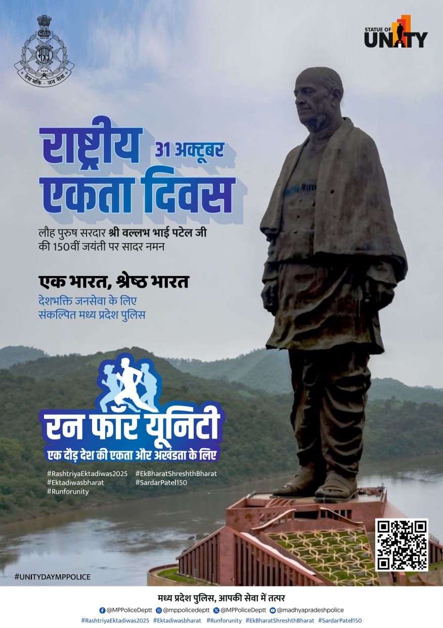 भोपाल, 29 अक्टूबर 2025। भारत के लौह पुरुष सरदार वल्लभभाई पटेल की 150वीं जयंती के अवसर पर पूरे देश में राष्ट्रीय एकता दिवस (National Unity Day) 31 अक्टूबर को मनाया जाएगा। इस उपलक्ष्य में मध्यप्रदेश पुलिस द्वारा राज्य के सभी जिलों और थाना स्तर पर “एकता दौड़ (Run for Unity)” का आयोजन किया जाएगा, जिसका उद्देश्य देशभर में राष्ट्रीय एकता, अखंडता और समरसता का संदेश फैलाना है।