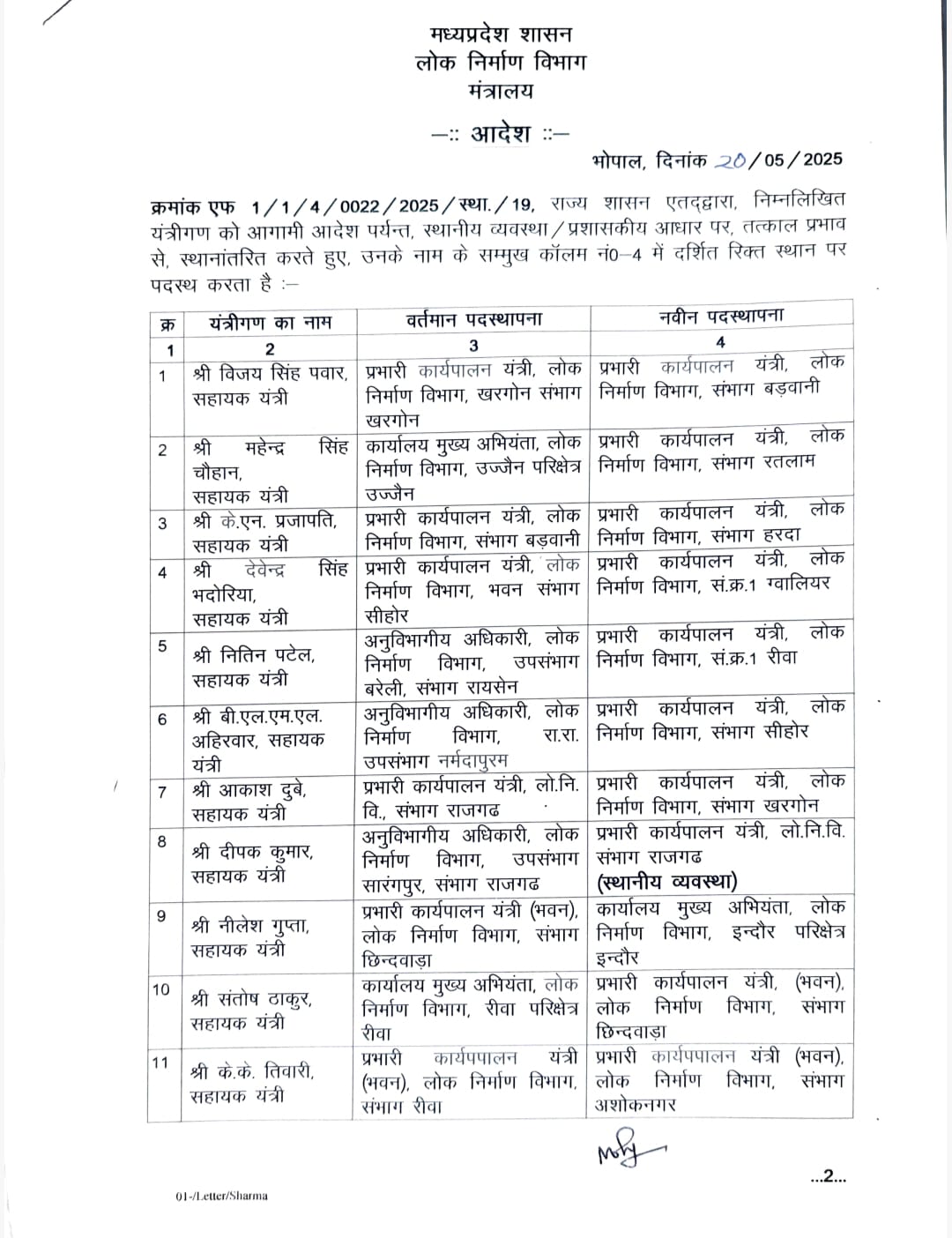मध्यप्रदेश में PWD विभाग के अधिकारियों का तबादला, भोपाल मुख्यालय से आदेश जारी