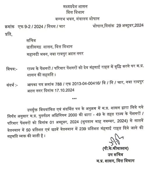 भोपाल – मध्य प्रदेश (MP) के पेंशनभोगियों के लिए बड़ी राहत की खबर है। प्रदेश सरकार ने छत्तीसगढ़ की तर्ज पर 50% महंगाई राहत (DR) देने पर सहमति जता दी है। जल्द ही इस संबंध में आधिकारिक घोषणा की जा सकती है, जिससे पेंशनरों को सीधा लाभ मिलेगा।