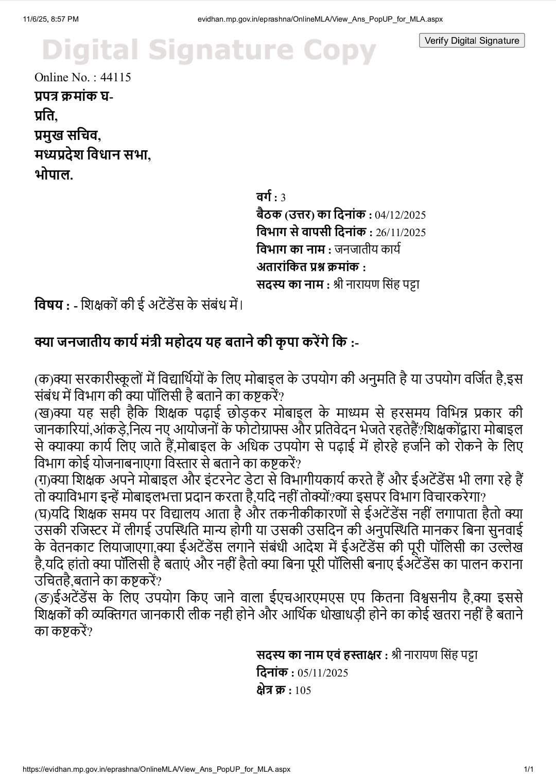 भोपाल। जनजातीय कार्य विभाग की ई-अटेंडेंस प्रणाली को लेकर अब सवालों का दौर शुरू हो गया है। कांग्रेस विधायक नारायण सिंह पट्टा ने शिक्षा विभाग से सूचना के अधिकार (RTI) के तहत विस्तृत जानकारी मांगी है। उनका कहना है कि यह प्रणाली शिक्षकों पर अनावश्यक तकनीकी दबाव डाल रही है और इससे शिक्षण कार्य प्रभावित हो रहा है।