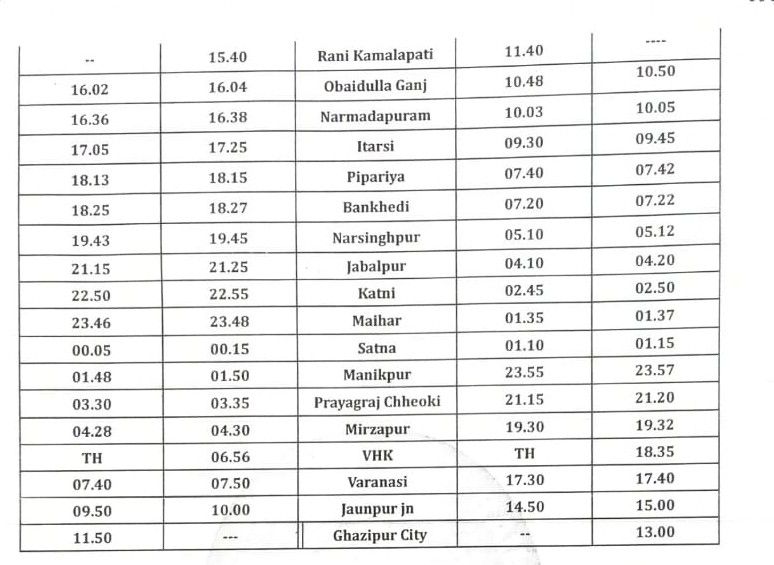 इस विशेष ट्रेन का ठहराव ओबेदुल्लागंज, नर्मदापुरम, इटारसी, पिपरिया, बनखेड़ी, नरसिंहपुर, जबलपुर, कटनी, मैहर, सतना, मानिकपुर, प्रयागराज छिवकी, मिर्जापुर, वाराणसी, जौनपुर जंक्शन स्टेशनों पर होगा।