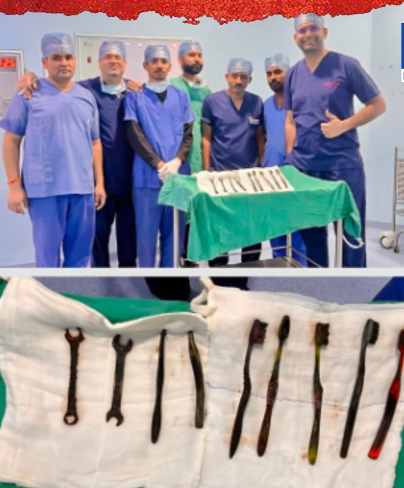 सर्जरी के दौरान डॉक्टरों ने युवक के पेट से 7 टूथब्रश और 2 लोहे के पन्ने निकाले। यह देखकर मेडिकल टीम भी हैरान रह गई, क्योंकि ऐसी वस्तुओं का पेट में जाना बेहद खतरनाक हो सकता है और जानलेवा स्थिति भी पैदा कर सकता है।