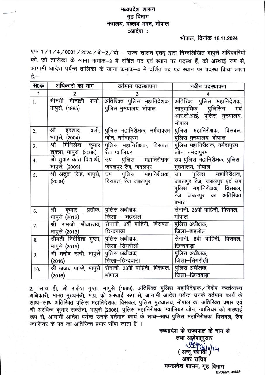 राज्य शासन द्वारा जारी सूची के अनुसार, अन्य कई अधिकारियों को भी इधर से उधर किया गया है। ये तबादले प्रशासनिक व्यवस्था को मजबूत बनाने के उद्देश्य से किए गए हैं।