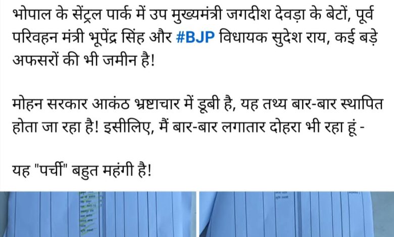 पटवारी ने भोपाल के सेंट्रल पार्क मामले का जिक्र करते हुए कहा कि जहां खुद अमिताभ बच्चन को निर्माण की अनुमति नहीं मिली, वहीं भाजपा के प्रभावशाली नेताओं और अधिकारियों ने “करप्शन की शूटिंग” पूरी कर ली। उन्होंने आरोप लगाया कि इस जमीन पर उप मुख्यमंत्री जगदीश देवड़ा के बेटों, पूर्व परिवहन मंत्री भूपेंद्र सिंह, भाजपा विधायक सुदेश राय और कई बड़े अधिकारियों की हिस्सेदारी है।