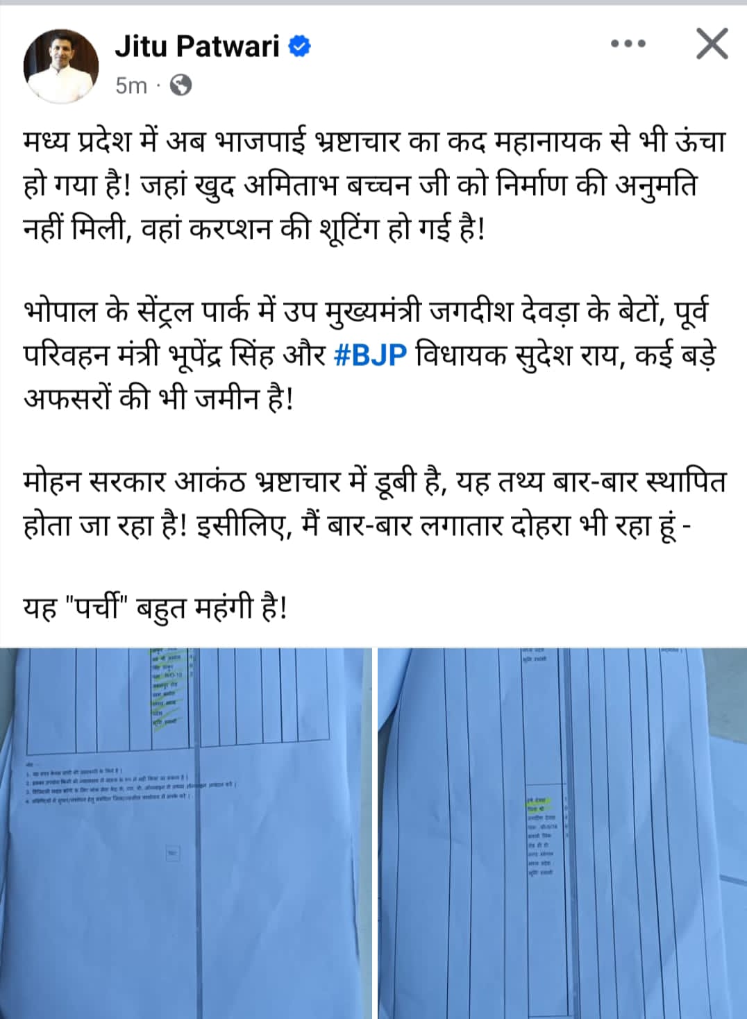 जीतू पटवारी ने इसे “मोहन सरकार” की भ्रष्टाचार में डूबी नीति का परिणाम बताया। उन्होंने कहा, “यह सरकार बार-बार साबित कर रही है कि भ्रष्टाचार में डूबने की उनकी कोई सीमा नहीं है। यही कारण है कि मैं बार-बार कहता हूं – यह ‘पर्ची’ बहुत महंगी है!”