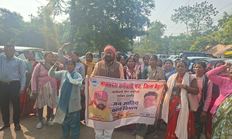भोपाल । भोपाल में बुधवार को जनजातीय कार्य विभाग के अस्थायी और दैनिक वेतन भोगी कर्मचारियों ने मध्य प्रदेश कर्मचारी मंच के नेतृत्व में विभागीय मुख्यालय आदि भवन, अरेरा हिल्स पर जोरदार प्रदर्शन किया। बैतूल जिले से आए सैकड़ों कर्मचारियों ने “कर्मचारी विरोधी आदेश वापस लो” और “सहायक आयुक्त की तानाशाही नहीं चलेगी” जैसे नारे लगाते हुए विभाग द्वारा जारी विवादित आदेश को तत्काल रद्द करने की मांग उठाई।