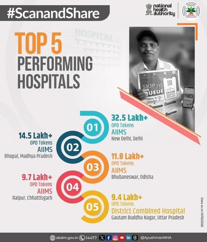 राष्ट्रीय स्वास्थ्य प्राधिकरण (NHA) द्वारा जारी आंकड़ों के अनुसार, एम्स भोपाल ने अब तक 14.5 लाख से अधिक ओपीडी टोकन स्कैन एंड शेयर माध्यम से जनरेट किए हैं। इस सूची में एम्स नई दिल्ली पहले स्थान पर है, जबकि भोपाल का एम्स दूसरे पायदान पर पहुंचा है, जो इसकी डिजिटल स्वास्थ्य सेवाओं में उत्कृष्टता को दर्शाता है।